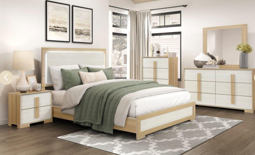 Bring a modern touch to your bedroom with the 2330 Bedroom-Sterling Collection. Its two-tone natural wood and white finish brighten your space, while durable materials ensure lasting quality. Choose from multiple bed sizes and complement with a nightstand, dresser, mirror, and chest—all designed with smooth-glide drawers and unique handles for effortless use and ample storage.