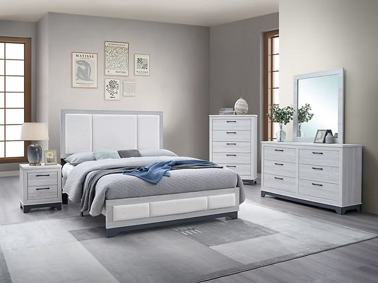 The B4940 Kevin Bedroom collection in light grey offers a sleek, modern platform bed that requires no box spring, providing sturdy support and a clean look. Available in queen and king sizes, it includes spacious storage options with a dresser, chest, nightstand, and a stylish mirror. Each piece combines functionality with contemporary design, making it perfect for creating a cohesive and inviting bedroom space. Upgrade your room effortlessly with this versatile and elegant set.
