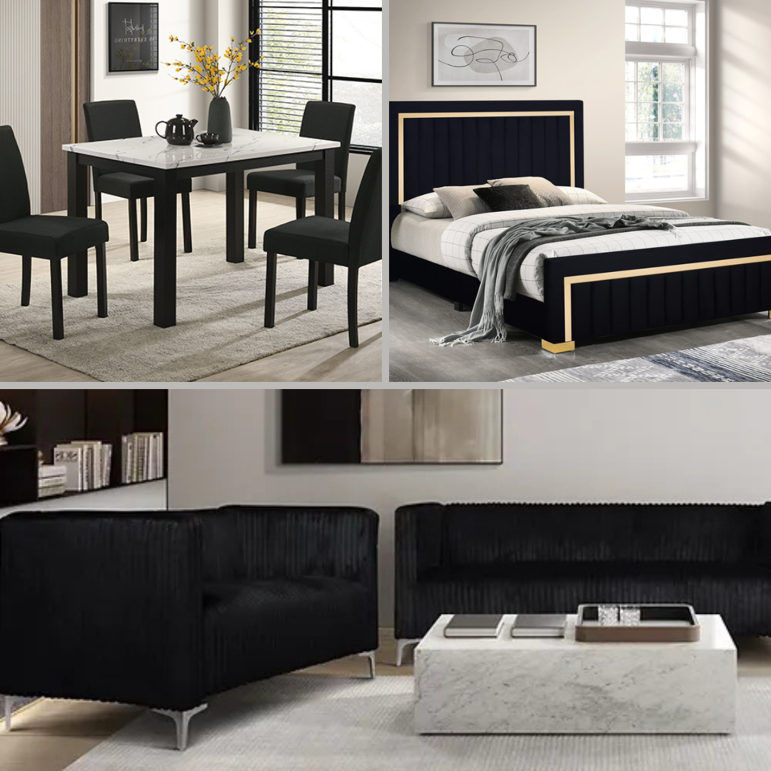 Enamórese del lujoso Bugly Lux blk 3ROOM. Este conjunto incluye un marco de cama de terciopelo suave, un juego de comedor de 5 piezas con cubierta de mármol sintético y cómodas sillas de tela voluminosa, y un acogedor sofá de 2 piezas y un sofá de dos plazas en suave tela de pana. Renueve su hogar con estilo y comodidad.