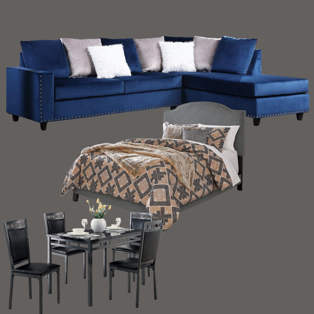 ¡Disfrute del lujo y la comodidad con la oferta 3ROOMS de Cindy Blue! Obtenga un impresionante sofá seccional reversible de terciopelo azul, un juego de 5 sillas blancas de imitación con cubierta de vidrio y una elegante cama de tela gris oscuro. Realce la decoración de su hogar y disfrute de la máxima relajación con este paquete todo en uno. ¡Ordene ahora!