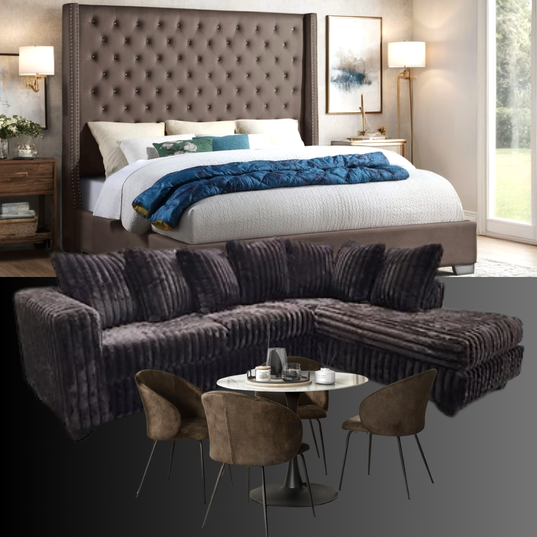 Transform your home with the Kayla 3 Room Brown deal: a luxurious velvet bed, a stylish 3-piece sectional, and a sleek 5-piece faux marble dining set—all designed to elevate comfort and elegance in every room. Don’t miss out on this complete upgrade!