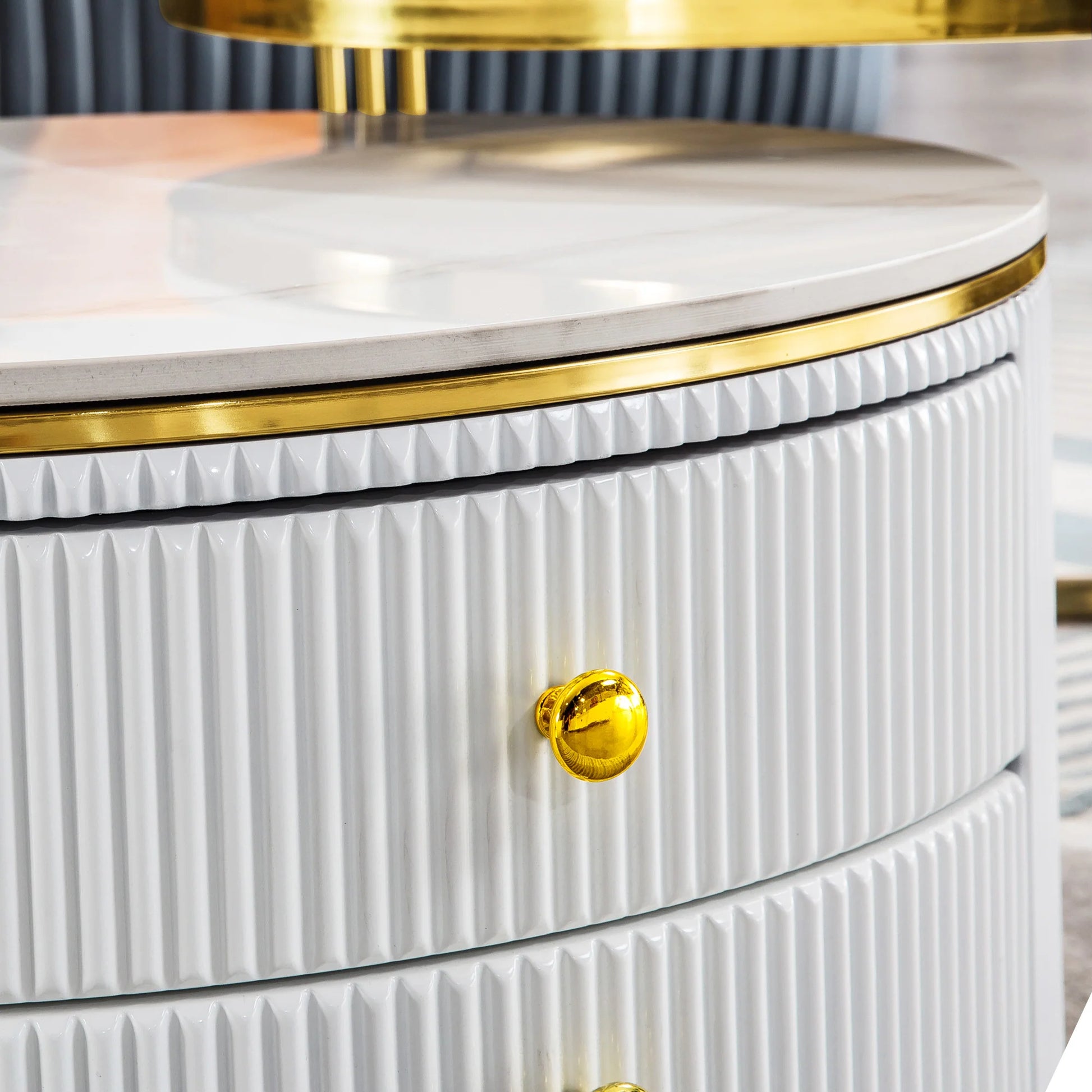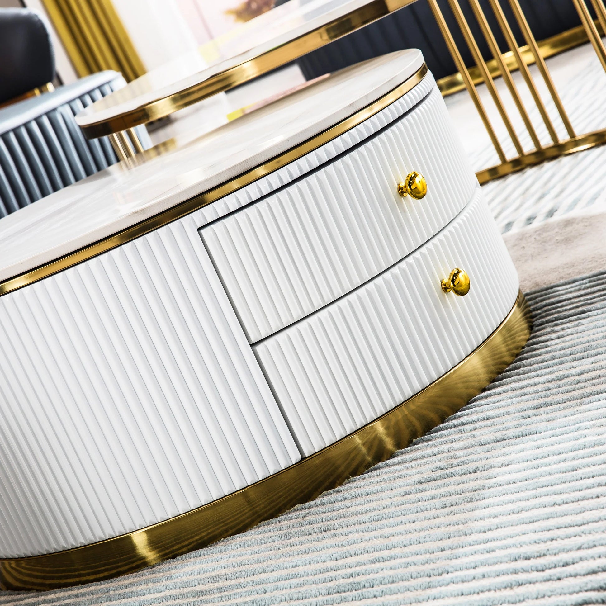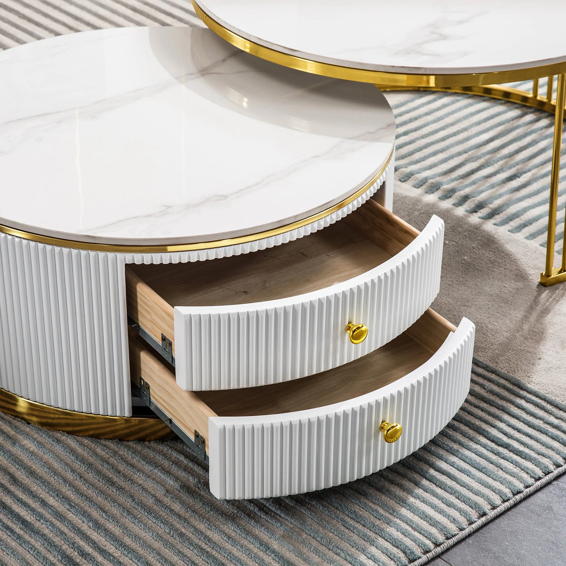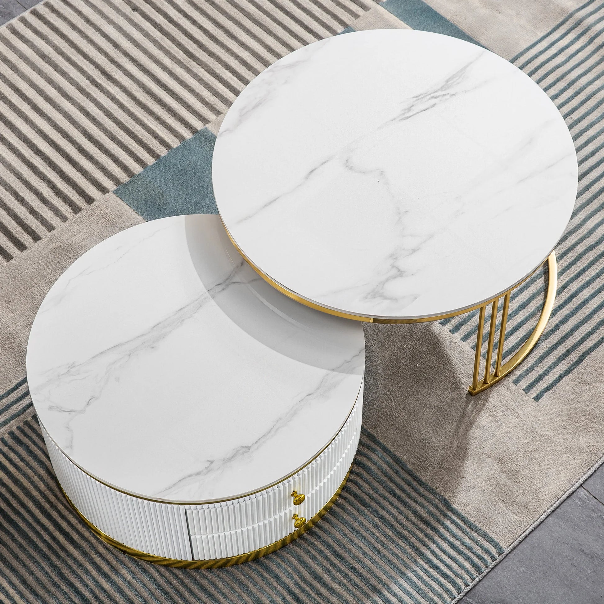 Discover the CT008 Coffee Table Set, a stylish two-piece ensemble crafted with durable MDF and finished in sleek white lacquer for a clean, modern look. Each table features a robust 12mm white sintered stone top, offering exceptional resistance to heat and scratches. Supported by a 201 stainless steel base with a luxurious gold finish, this set blends elegance with lasting strength, perfect for elevating your living area with a touch of contemporary sophistication.