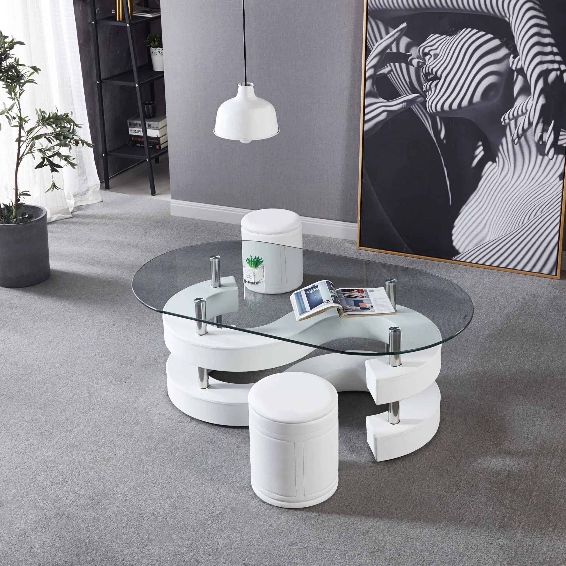 The CT255 Coffee Table Set features a 10mm tempered glass top, combining sleek MDF and metal for durability and modern appeal. Included are two round stools upholstered in comfortable PU, offering versatile seating. Available in black, white, brown, and red, this set blends style and function to enhance any living area with lasting elegance and practicality.